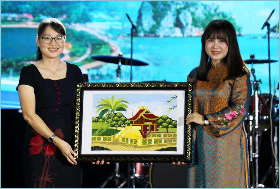Cục trưởng Cục Văn hóa cơ sở, Gia đình và Thư viện (Bộ Văn hóa, Thể thao và Du lịch) Ninh Thị Thu Hương, Trưởng ban Tổ chức Liên hoan (bên phải) tặng quà cho đơn vị đăng cai.