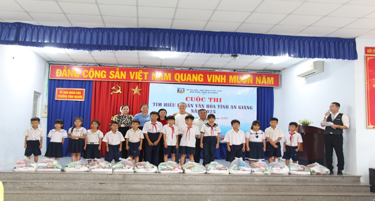 Nhân dịp này, Ban Tổ chức phối hợp với nhóm thiện nguyện Tâm An, thành phố Châu Đốc trao tặng 66 phần quà cho các em học sinh có hoàn cảnh khó khăn Trường tiểu học A Vĩnh Nguơn, Trường tiểu học Trần Quốc Toản, Trường Trung học cơ sở Vĩnh Nguơn, mỗi phần quà trị giá 270.000đ