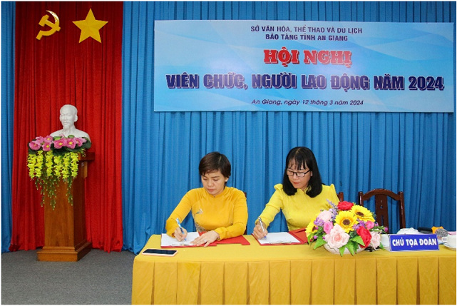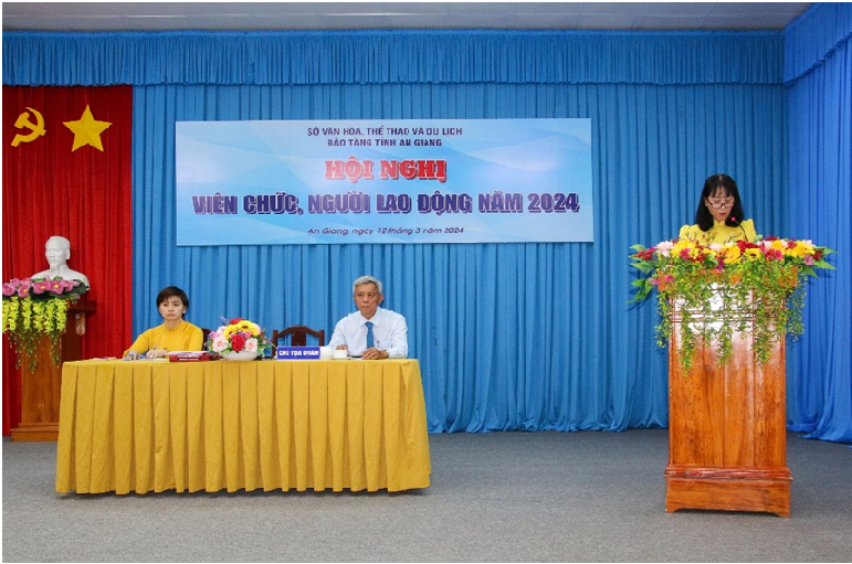 Phát biểu chỉ đạo tại Hội nghị, đồng chí Hồ Thị Hồng Chi,Ủy viên Ban chấp hành Đảng bộ Sở Văn hóa, Thể thao và Du lịch An Giang nhiệt liệt biểu dương tập thể viên chức, người lao động Bảo tàng đã nêu cao tinh thần trách nhiệm, sự đoàn kết thống nhất, nỗ lực hoàn thành xuất sắc nhiệm vụ được giao. Đồng thời, đồng chí định hướngđơn vị tiếp tục nỗ lực, phát huy hơn nữa những kết quả đạt được để tiến đến thực hiện thắng lợi nhiệm vụ công tác năm 2024, chú trọng đổi mới, đa dạngcác hoạt động truyền thông, những hoạt động giới thiệu, quảng bá cũng như bảo tồn và phát huy những di sản văn hóa của tỉnh An Giang, đặc biệt là di sản văn hóa các dân tộc, các hoạt động sinh hoạt hè, các chương trình giáo dục, “Giờ học lịch sử” thông qua Di sản văn hóa tại Bảo tàng.
