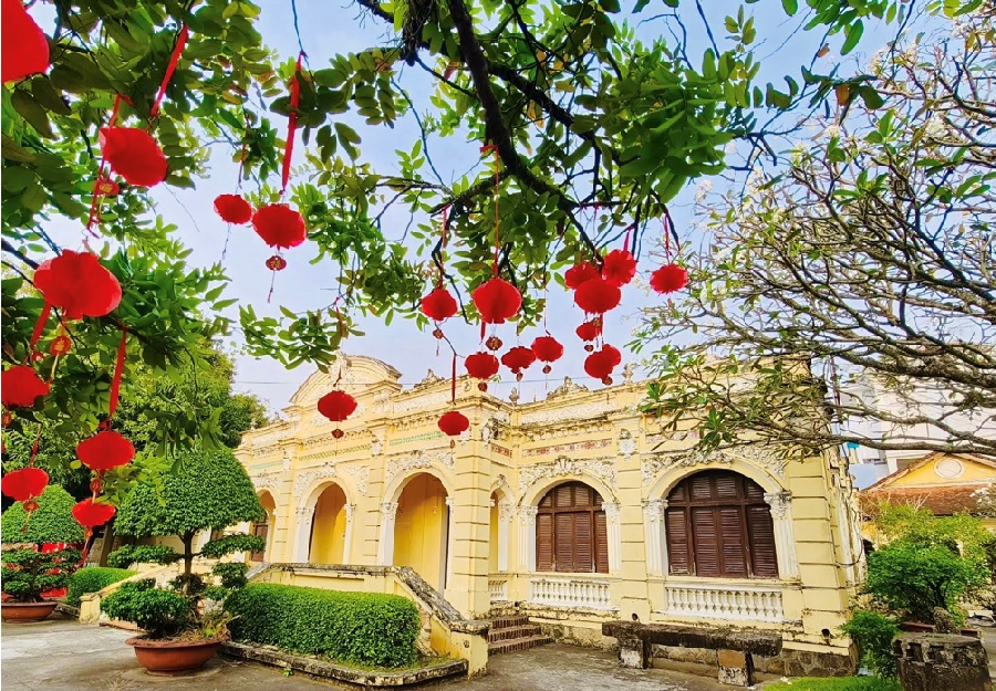 Tọa lạc trong khuôn viên xanh mát, Bảo tàng tỉnh An Giang (cơ sở 1) mang dáng dấp của một ngôi nhà cổ kiến trúc Pháp đặc trưng, với những vòm cửa cong và gam màu vàng trầm ấm. Không gian ấy vừa trang nghiêm, cổ kính, vừa gần gũi và nên thơ, tạo nên phông nền lý tưởng cho những bộ ảnh xuân mang đậm hồn Việt.