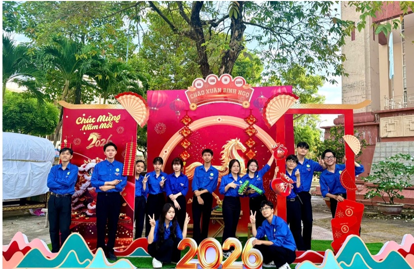 Các bạn sinh viên trường Đại học An Giang chụp ảnh tại phông nền chụp ảnh Tết của Bảo tàng tỉnh An Giang (cơ sở 2).