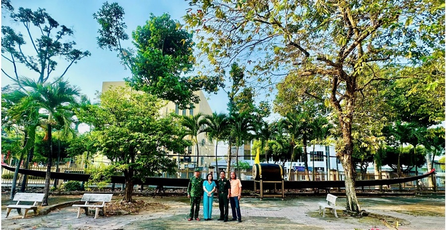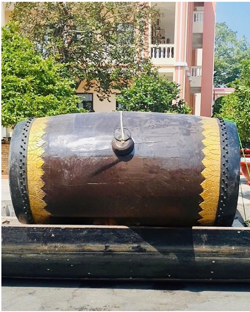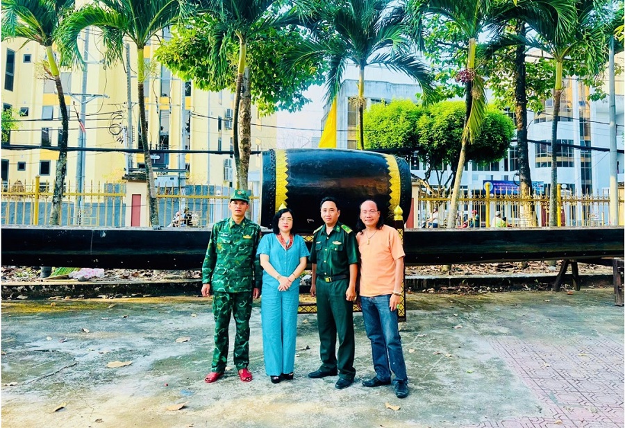Bà Dương Thị Bảo Châu – Phó Giám đốc Bảo tàng tỉnh An Giang chụp ảnh lưu niệm cùng đại diện Ban Chỉ huy Bộ đội Biên phòng tỉnh An Giang trước hiện vật ghe Ngo và trống.