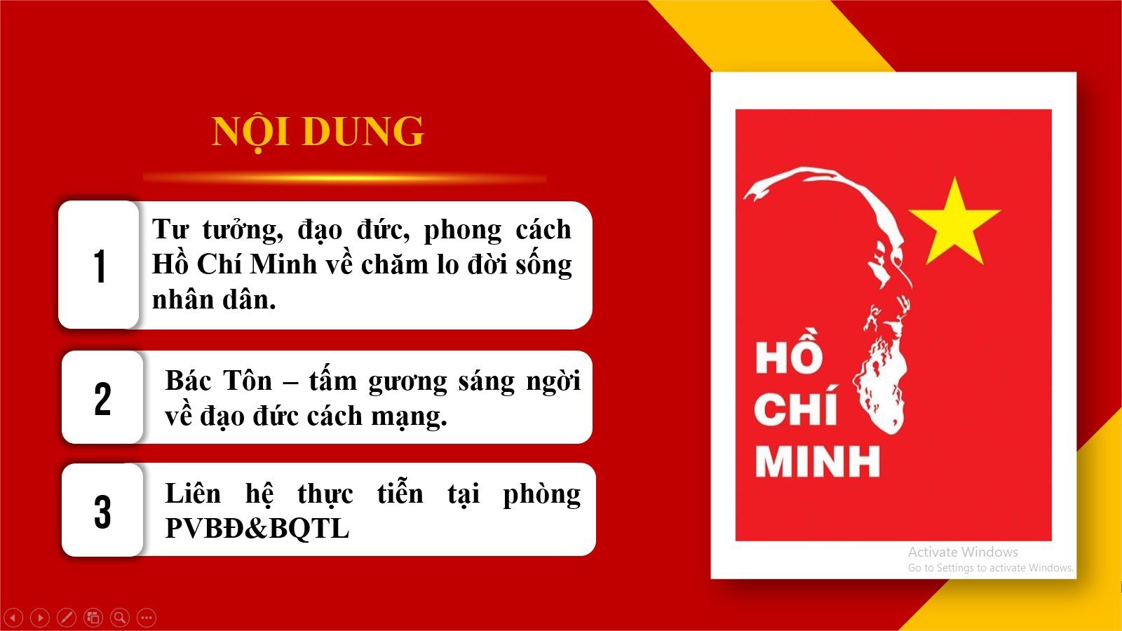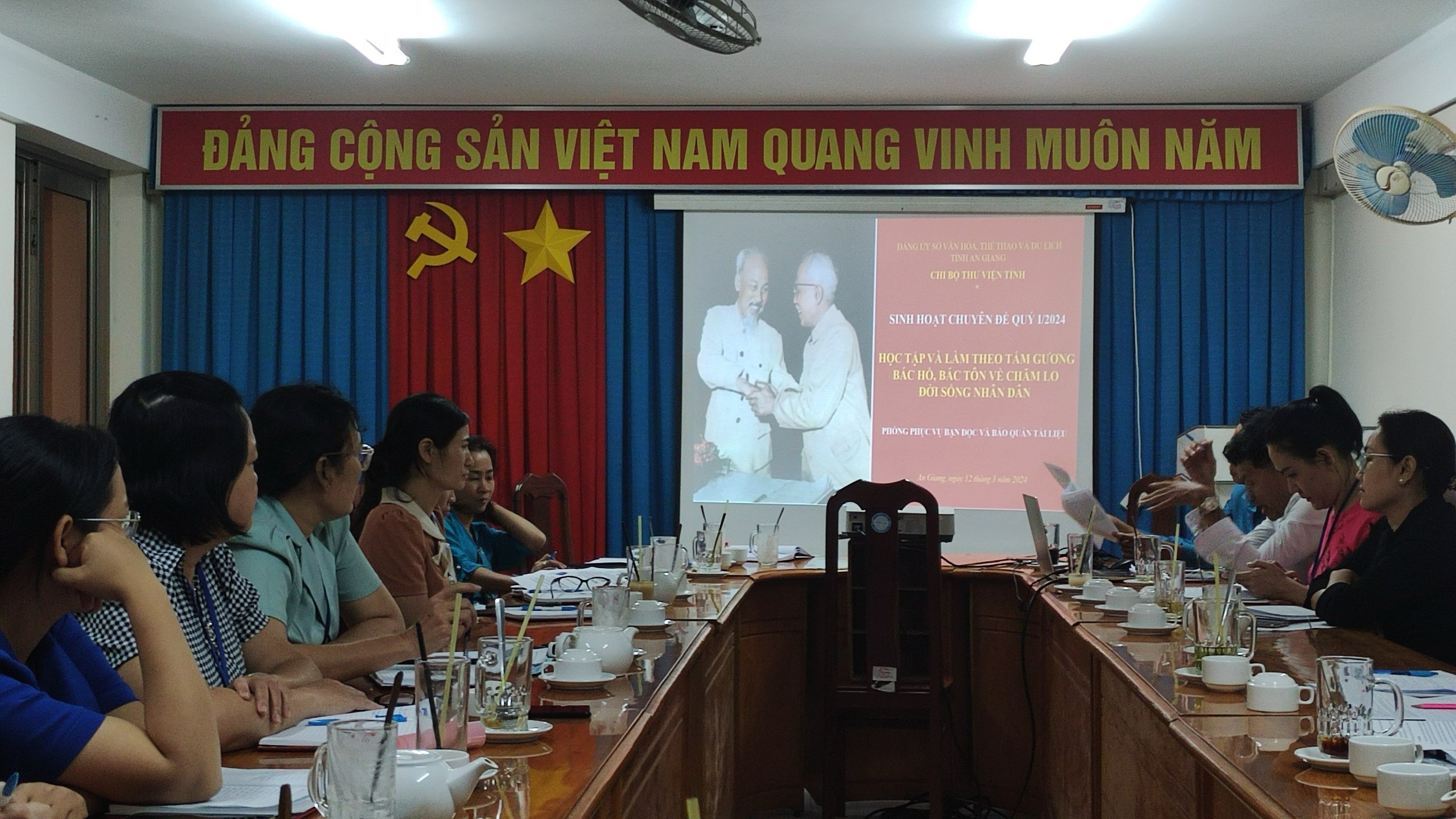 Trong buổi sinh hoạt, tập thể đảng viên Phòng Phục vụ bạn đọc và Bảo quản tài liệu đã trình bày các nội dung: Tư tưởng, Đạo đức, Phong cách Hồ Chí Minh về chăm lo đời sống nhân dân; Bác Tôn – tấm gương sáng ngời về đạo đức cách mạng; thực tiễn về việc học tập và làm theo tấm gương Bác Hồ, Bác Tôn về chăm lo đời sống nhân dân gắn với nhiệm vụ chuyên môn của phòng. Buổi sinh hoạt đã nhận được sự đóng góp ý kiến, thảo luận sôi nổi từ các đảng viên của Chi bộ, bởi việc lắng nghe chia sẻ qua góc nhìn của đảng viên sinh hoạt cùng chi bộ; người đồng chí, đồng nghiệp tại cơ quan đơn vị mình thì những câu chuyện về Tư tưởng, Đạo đức, Phong cách Hồ Chí Minh; tấm gương Đạo đức Bác Tôn sẽ trở nên gần gũi, chân thực và sống động hơn. Đồng thời, qua đó cũng giúp phòng Phục vụ Bạn đọc và Bảo quản tài liệu cũng như các đồng chí đảng viên trong chi bộ sẽ nhận thức rõ hơn về vai trò và trách nhiệm của mình trong việc thực hiện thắng lợi nhiệm chính trị, nhiệm vụ chuyên môn mà tập thể đã giao phó.