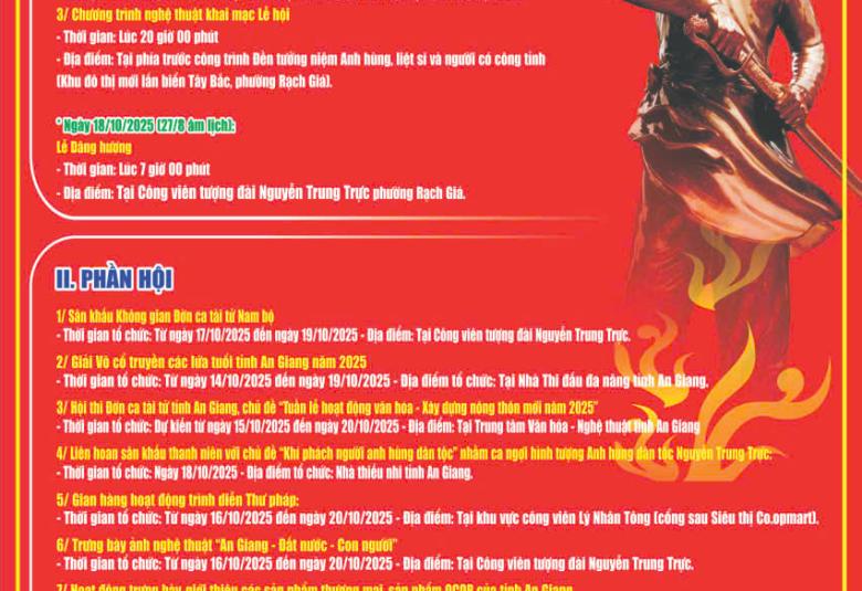 Lễ hội truyền thống kỷ niệm 157 năm ngày Anh hùng dân tộc Nguyễn Trung Trực hy sinh diễn ra từ ngày 17 đến ngày 19/10/2025 (26 – 28/8 âm lịch) tại phường Rạch Giá, tỉnh An Giang. Sự kiện nhằm tưởng nhớ công lao to lớn của vị anh hùng dân tộc, đồng thời góp phần bảo tồn và phát huy giá trị di sản văn hóa phi vật thể quốc gia “Lễ hội Đình thần Nguyễn Trung Trực – Rạch Giá”.