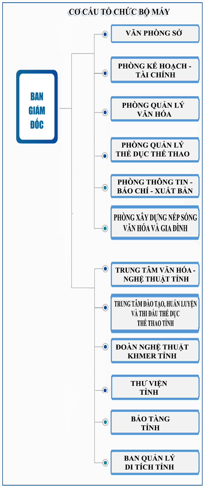 Cơ cấu tổ chức bộ máy Giới thiệu 16/08/2023 - aA + Xuân Phương Tin tức liên quan Ban Giám đốc Giới thiệu 22/08/2023 Giới thiệu chung Giới thiệu 16/08/2023 Trung tâm VHTTTT huyện, thị xã, thành phố Giới thiệu 26/04/2023 Phòng VHTT huyện, thị xã, thành phố Giới thiệu 26/04/2023 Các phòng, đơn vị thuộc sở Giới thiệu 26/04/2023 Chức năng, nhiệm vụ Giới thiệu 26/04/2023