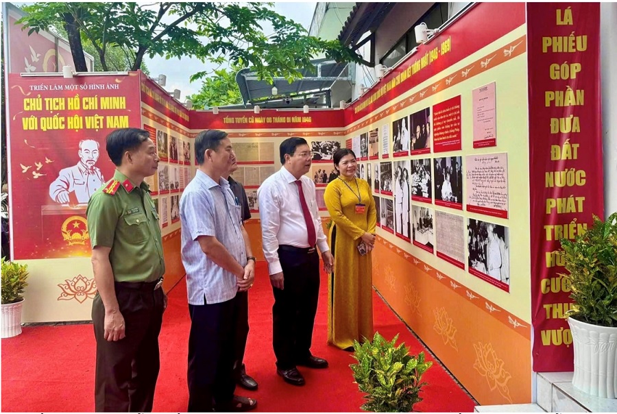Đồng chí Nguyễn Tiến Hải - Bí thư Tỉnh ủy An Giang và đồng chí Nguyễn Thị Hoàn Xuân - Phó Bí thư Đảng ủy phường Rạch Giá tham quan gian trưng bày tuyên truyền bầu cử chuyên đề “Chủ tịch Hồ Chí Minh với Quốc hội Việt Nam” do Bảo tàng tỉnh An Giang thực hiện.
