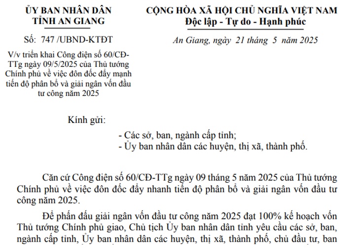 Nhằm phấn đấu hoàn thành mục tiêu giải ngân 100% kế hoạch vốn đầu tư công năm 2025 theo chỉ đạo của Thủ tướng Chính phủ, Chủ tịch UBND tỉnh An Giang yêu cầu toàn bộ hệ thống chính quyền, các sở, ngành, địa phương và chủ đầu tư tập trung cao độ, triển khai đồng bộ, quyết liệt các giải pháp trọng tâm để đẩy mạnh tiến độ thực hiện và giải ngân vốn đầu tư công.