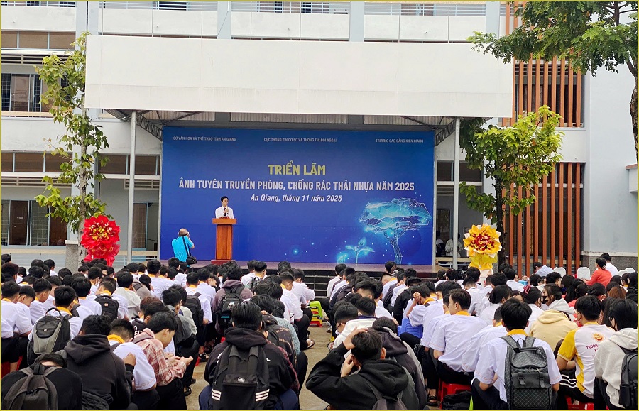 Sáng 17/11, tại Trường Cao đẳng Kiên Giang, phường Rạch Giá, tỉnh An Giang, Cục Thông tin cơ sở và Thông tin đối ngoại, Bộ Văn hóa, Thể thao và Du lịch phối hợp với Sở Văn hóa và Thể thao tỉnh An Giang, Trường Cao đẳng Kiên Giang tổ chức Triển lãm ảnh, tư liệu tuyên truyền phòng, chống rác thải nhựa năm 2025.