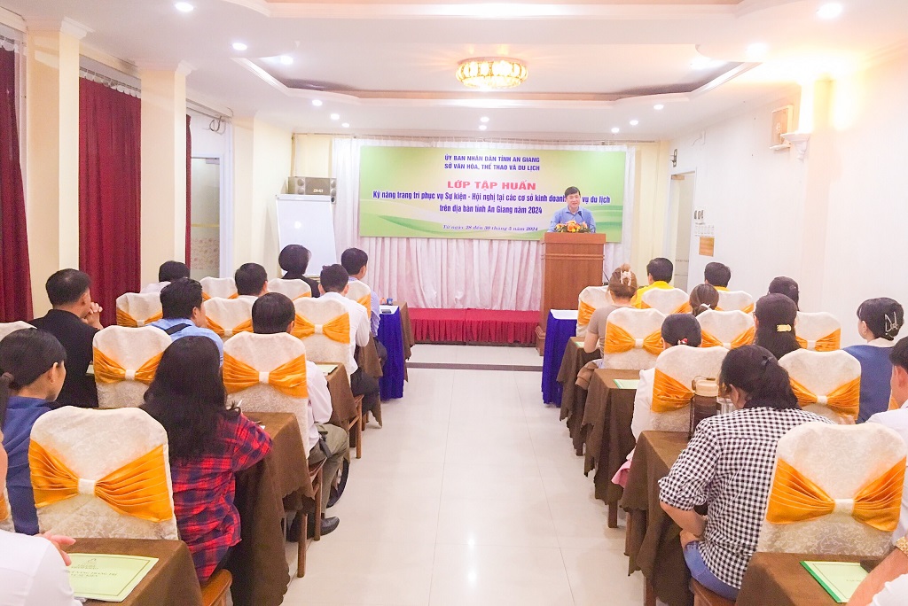 Sáng ngày 28/5/2024, Sở Văn hóa, Thể thao và Du lịch An Giang phối hợp với Trường Cao đẳng Du lịch Sài Gòn tổ chức khai giảng lớp “Tập huấn kỹ năng trang trí phục vụ Sự kiện - Hội nghị tại các cơ sở kinh doanh dịch vụ du lịch trên địa bàn tỉnh An Giang”, lớp tập huấn diễn ra trong ba ngày, từ ngày 28/5/2024 đến ngày 30/5/2024.