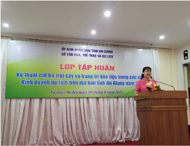 Sáng ngày 06 tháng 8 năm 2024 tại thành phố Long Xuyên, Sở Văn hóa, Thể thao và Du lịch phối hợp Trường Cao đẳng Du lịch Cần Thơ tổ chức khai giảng lớp tập huấn kỹ thuật cắt tỉa trái cây và trang trí bàn tiệc trong các cơ sở kinh doanh du lịch trên địa bàn tỉnh An Giang, lớp tập huấn diễn ratrong 03 ngày, từ ngày 06/8/2024 đến ngày 08/8/2024.
