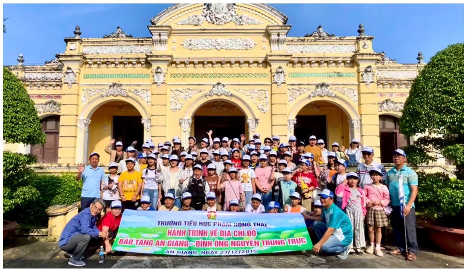 Giáo viên và học sinh Trường Tiểu học Phạm Hồng Thái chụp ảnh lưu niệm tại Bảo tàng tỉnh An Giang.