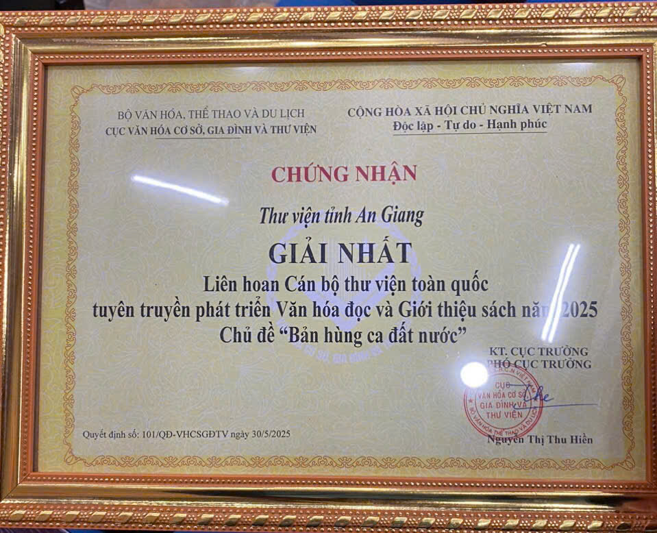 Từ ngày 26 đến ngày 30 tháng 5 năm 2025, Thư viện An Giang đã tham gia Liên hoan Cán bộ Thư viện toàn quốc tuyên truyền phát triểnVăn hóa đọc và giới thiệu sách Kỷ niệm các ngày lễ lớn và sự kiện lịch sử quan trọng của đất nước, với chủ đề “Bản hùng ca đất nước”, diễn ra tại thành phố Buôn Ma Thuột, tỉnh Đắk Lắk.