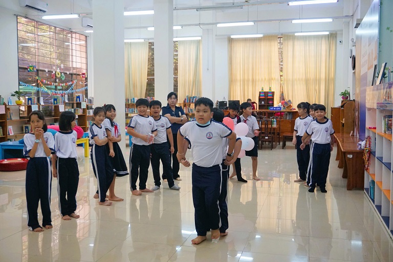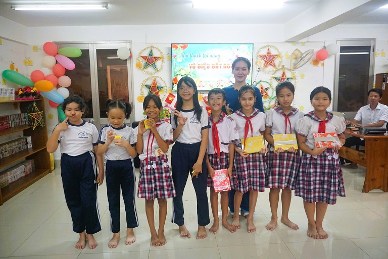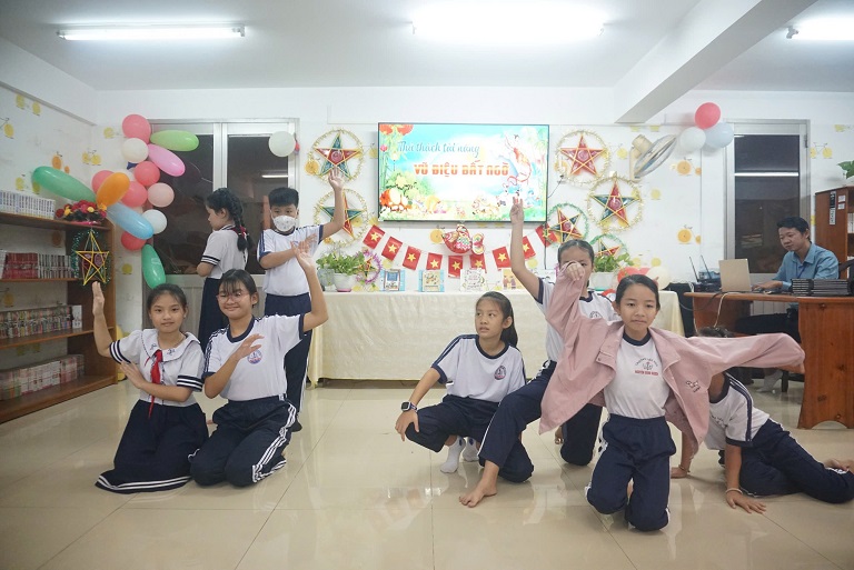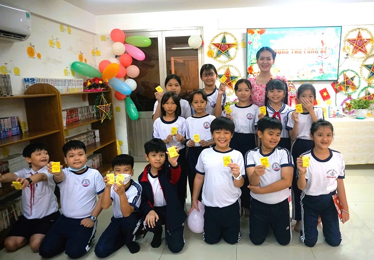 Chương trình như một ngày hội sôi động và bổ ích, mang đến cho các em hàng loạt hoạt động vừa học vừa chơi. Các em hào hứng tham gia thử thách tài năng “Vũ điệu bất ngờ,” cùng thắp sáng ước mơ qua hoạt động khéo tay làm “Lồng đèn lung linh,” cùng nhau khám phá những trò chơi vận động như “Cuộc phiêu lưu với bóng bay,” và trải nghiệm sự thông minh, sáng tạo với máy tính bảng trong phần thi “Vui học, thông minh.” Đặc biệt, các em còn được hòa mình vào không gian vui tươi của hoạt động "Phá cỗ đón trăng" qua lễ hội quà tặng “Nhạc lên, quà về” đầy thú vị. Những nụ cười rạng rỡ trên khuôn mặt của các bạn nhỏ chính là món quà ý nghĩa nhất dành cho Thư viện.