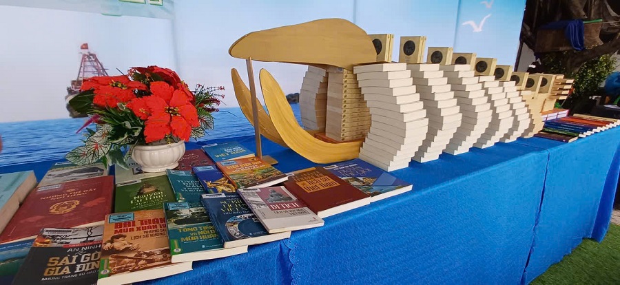 Gian trưng bày sách giới thiệu hơn 2.500 bản sách, báo và tài liệu với nội dung phong phú, gồm lịch sử, văn hóa biển đảo Việt Nam, chủ quyền Quốc gia, tín ngưỡng thờ Cá Ông, văn hóa, du lịch An Giang, kỹ năng sống, sách thiếu nhi, sách minh họa nổi, các bài dự thi đạt giải Cuộc thi Đại sứ Văn hóa đọc… Một trong những điểm nhấn đặc sắc tại khu trưng bày là cụm mô hình xếp sách nghệ thuật gồm bộ xương Cá Ông, mô hình xếp sách nghệ thuật chữ “Lại Sơn” ở vị trí trung tâm và mô hình ngọn Hải Đăng, được bố trí hài hòa, giàu tính thẩm mỹ. Sự kết hợp giữa ba mô hình tạo nên một không gian biểu tượng trực quan, vừa đẹp mắt vừa mang chiều sâu văn hóa biển đảo. Cụm mô hình không chỉ góp phần tái hiện câu chuyện văn hóa của cư dân vùng biển Kiên Hải mà còn tôn vinh tri thức, truyền thống và bản sắc địa phương thông qua các hình tượng gần gũi, dễ cảm nhận đối với người xem.