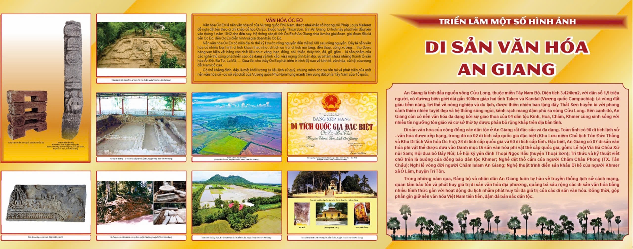 Bảo tàng An Giang sưu tầm, chọn lọc triển lãm hơn 150 hình ảnh liên quan đến di sản văn hóa tiêu biểu của tỉnh An Giang, bao gồm di tích lịch sử văn hóa tiêu biểu được xếp hạng cấp tỉnh, cấp quốc gia và quốc gia đặc biệt; hiện vật văn hóa Óc Eo; các lễ hội, nghề truyền thống của bốn dân tộc Kinh, Chăm, Hoa, Khmer.