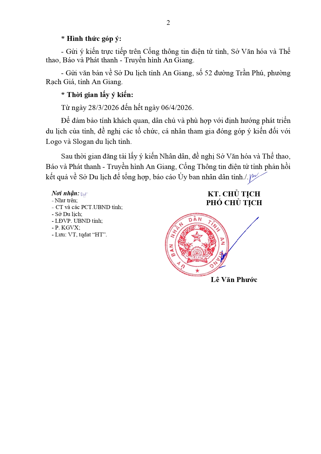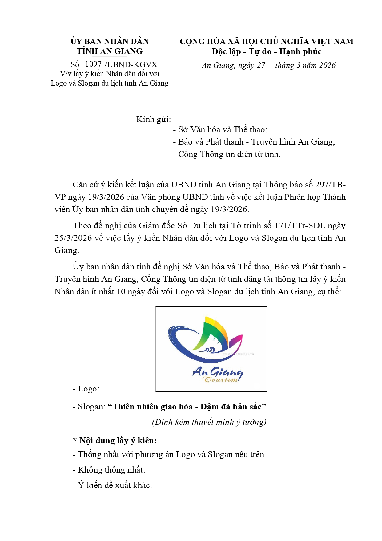 V/v lấy ý kiến Nhân dân đối với Logo và Slogan du lịch tỉnh An Giang Thông báo 31/03/2026 - aA + Tài liệu đính kèm: file:///C:/Users/Admin/Downloads/1097-UBND-KGVX.signed.signed.pdf (896.49 KB) Xuân Phương Tin tức liên quan THÔNG BÁO Về việc lấy ý kiến góp ý dự thảo Quyết định quy định định mức kinh tế – kỹ thuật dịch vụ sự nghiệp công sử dụng ngân sách nhà nước trong lĩnh vực phát thanh, truyền hình trên địa bàn tỉnh An Giang Thông báo 24/03/2026 Thông báo Điều chỉnh thời gian tổ chức và tiếp nhận tác phẩm dự thi Cuộc thi sáng tác biểu tượng (logo) tỉnh An Giang Thông báo 11/02/2026 Thông báo Thể lệ Cuộc thi sáng tác biểu tượng (Logo) tỉnh An Giang Thông báo 06/01/2026 V/v lấy ý kiến Nhân dân đối với các trường hợp đề nghị tặng Huân chương Lao động Thông báo 27/11/2025 THÔNG BÁO KẾT QUẢ LỰA CHỌN TỔ CHỨC HÀNH NGHỀ ĐẤU GIÁ TÀI SẢN Thông tin báo chí – Công bố công khai Thông báo 16/05/2025 Thông báo về việc lựa chọn tổ chức đấu giá tài sản Thông báo 25/04/2025